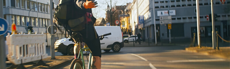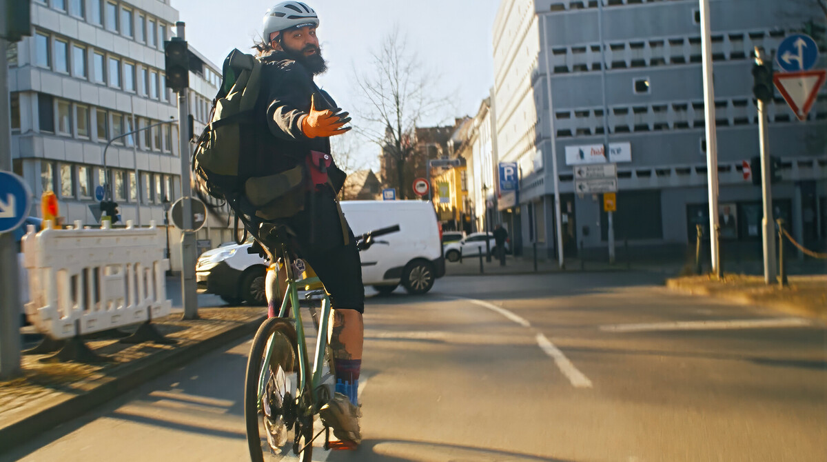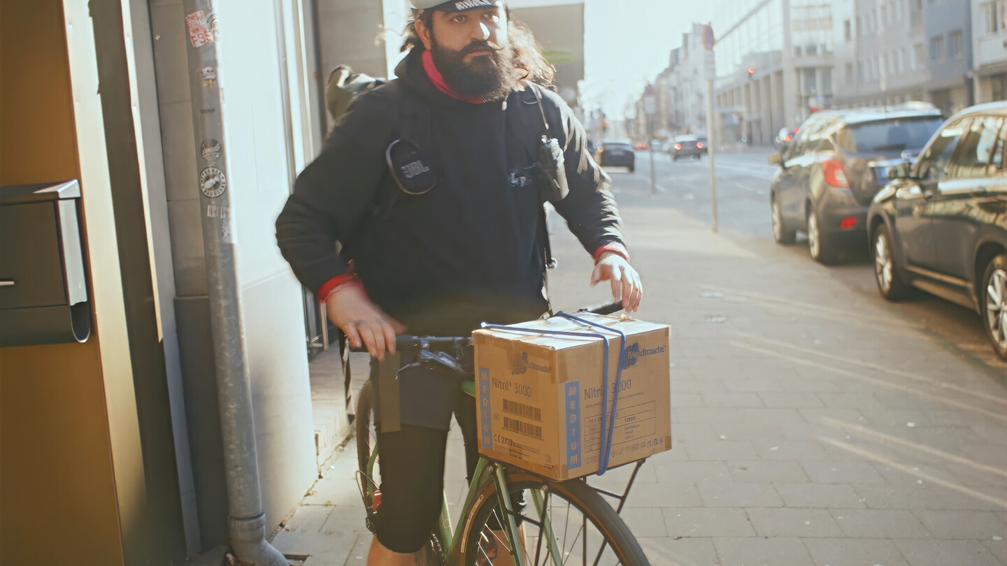 Albert Rabaev is a bicycle courier in Düsseldorf. In Wie der Hase läuft, he gives us a glimpse into his everyday life: why he loves his job, what sometimes drives him crazy, and the wildest deliveries he’s ever had to make. In his work, where time is money, pressure is a constant companion. But Albert thrives on the fast-paced rhythm of urban pedaling, radio dispatches, and elevator rides. He enjoys the sense of freedom that comes with his unusual job—a feeling he shares with bicycle couriers all over the world.
